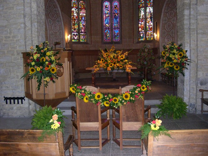 Bouquet de mariée, boutonnière, choeur d'église, bancs, voiture.